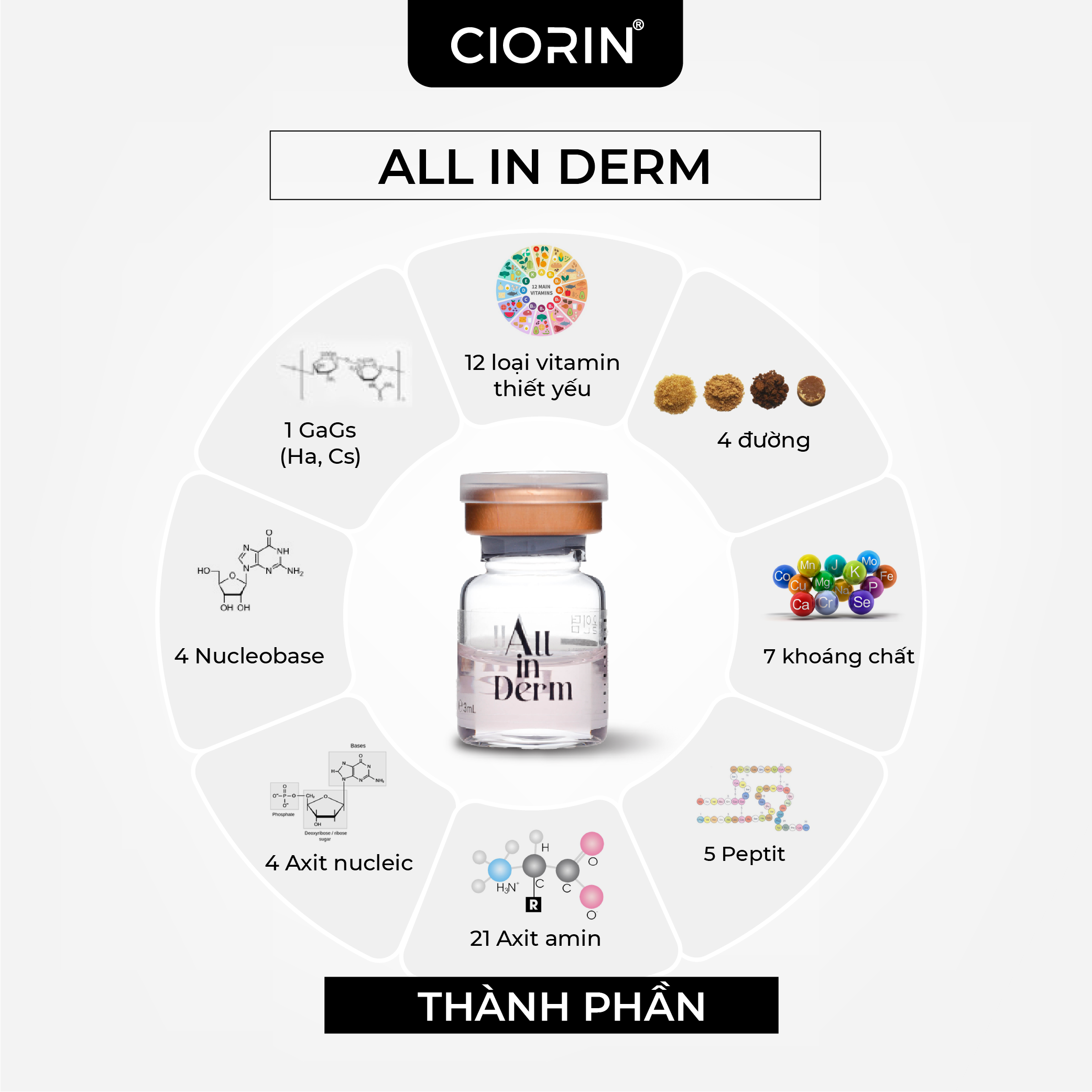 Tinh chất cấy meso Ciorin All In Derm giúp phục hồi da, chống oxy hóa, cải thiện nám sạm, tăng độ dày biểu bì, phù hợp mọi loại da.